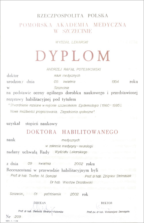 Dr hab. n. med. Andrzej Potemkowski prof. US jest absolwentem Wydziału Lekarskiego Pomorskiej Akademii Medycznej, którą ukończył z wyróżnieniem w 1978 r. W latach 1978 r. - 1999 r. pracował jako asystent, a następnie adiunkt w Klinice Neurologii PAM w Szczecinie. W 1986 r. uzyskał stopień naukowy doktora nauk medycznych, a w 2002 r. stopień naukowy doktora habilitowanego nauk medycznych w zakresie medycyny. Od 1987 r. prowadzi Indywidualną Specjalistyczną Praktykę Lekarską w Szczecinie. W 2008 r. został powołany na stanowisko profesora nadzwyczajnego Uniwersytetu Szczecińskiego i kierownika Zakładu Psychologii Klinicznej i Psychoprofilaktyki US.